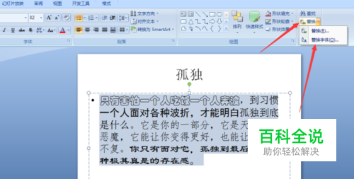 首先,打开你所需要修改的文档,下面是我举的一个例子,里面的文字有很多形式的字体,接下来我来介绍如何快速替换它们。选中你所要替换字体的文字,然后在开始单位栏里找到替换字体,如图所示。