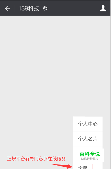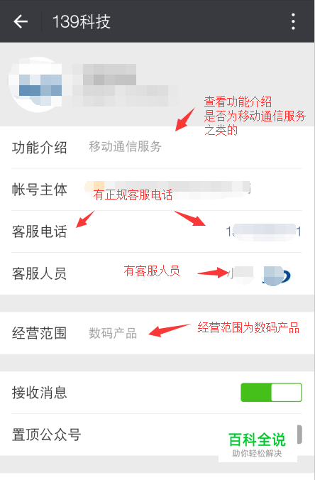第二个看公众号介绍页,正规的公众号充值功能介绍为移动通信服务,账号主体为科技类公司,有专门的客服电话,客服人员,经营范围为数码产品。