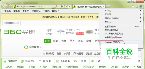 打开浏览器窗口,单击“工具”按钮,在弹出的菜单中选择“Internet选项”选项。