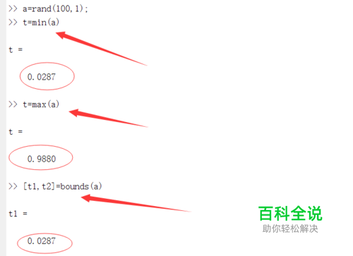 最大值最小值: min:求出数组中的最小值数据; max:求出数组中的最大值数据; bounds可以同时求出数组中的最小数值和最大数值。代码如下: a=rand(100,1) t=min(a) t=max(a) [t1,t2]=bounds(a)