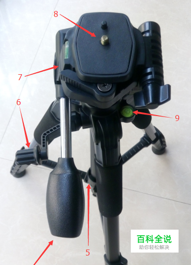 具体的使用方法: 先打开三脚架,可以选择把脚架的板扣打开,调到自己需要的高度。 然后将中间轴的旋钮锁锁定——1处。 如果使用了高度摇手(图中2),升高高度后,升降高度自由锁紧旋钮要扭紧——3处。 如果是用相机侧拍,调整角度后,相机侧拍控制旋钮应锁定——4处。 然后来装相机等设备。 快装板卡锁——5处,逆时针拨动,就可以取下快装板。 然后将相机装上快装板。 相机装在云台上。 按回快装板卡锁即可。 详细步骤如图。 手机的就是将手机夹装上快装板,相同步骤操作即可。