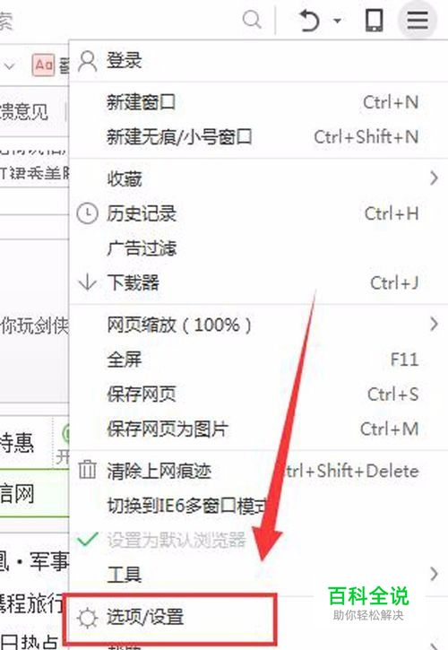 2、待360安全浏览器安装到电脑上以后,打开浏览器,在浏览器右上角设置找到“选项/设置”,点击该设置,进入“选项”面板,如图