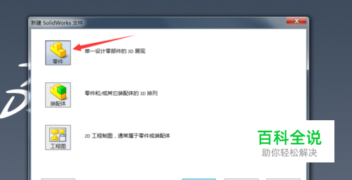 首先打开solidworks绘图软件,点击新建,选择新手,再点击零件按钮。