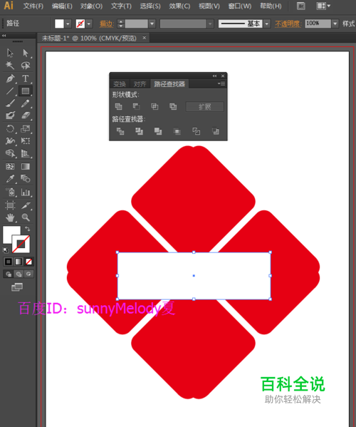为了方便后面的制作,我们可以选择这4个图形,然后点击路径查找器中的联集,将其合并为一个整体。选择工具箱中的矩形工具,将填充设置为白色,描边设置为无,画一个矩形。跟上面相同的方法,我们按快捷键Ctrl+C,Ctrl+V,然后在变换面板中设置旋转角度为90度,按enter键确定。