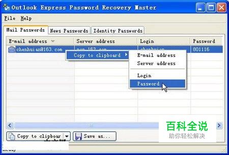 安装并运行Outlook Express Password Recovrey Master,软件会自动搜索到在Outlook Express中设置的邮箱账户。邮件单击邮箱账户,依次选择“Copy to clipboard(复制到剪切板)” →“Password(密码)”命令,如图所示。