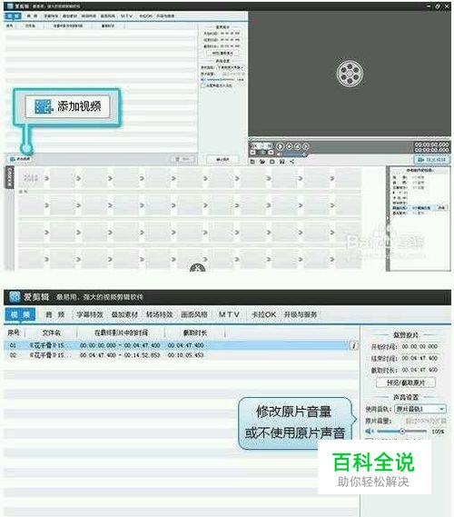 过滤杂音:点击“添加视频”按钮,把手机拍的视频导入爱剪辑。在视频列表右侧,我们可以选择“不使用原片声音”或调小原片音量,以达到过滤杂音。