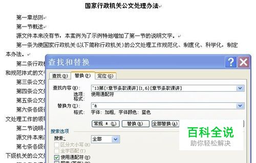 还有另外一种情况,就是不含标题,只是把带有章节条款课讲等数字序号查找出来: 在查找栏输入:^13第[!章节条款课讲]{1,6}[章节条款课讲] 替换栏:^& (&后面有两个空格,本括号为说明不是要键入的内容),设置中点开格式菜单,选择字体,选择需要的字体,本例选黑体 在下方”使用通配符“前打勾, 如下图所示:
