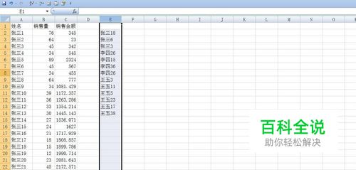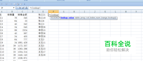 首先我们来选定一组数据,如图所示,查找E列销售人员的销售金额,如果我们手动查找的话需要很多时候,效率很低,那么此时我可用vlookup进行查找。