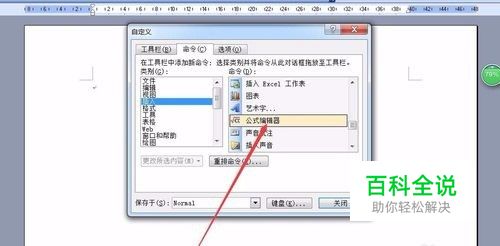 2、“自定义”栏目中选择“命令”鼠标的滚动条拉下选择“公式编辑器”