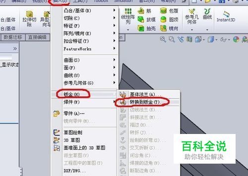 第二步,选择插入--钣金--转换到钣金,点击,弹出钣金转换设置选项。