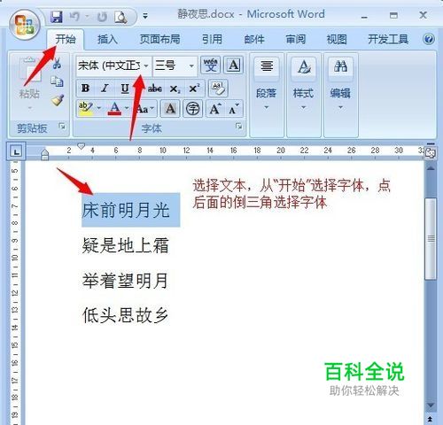 2.设置字号: 选择文本信息,从“开始”菜单选择字号