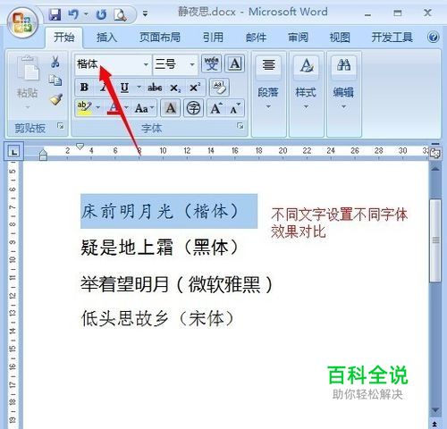 1.设置字体: 选择文本信息,从“开始”菜单选择字体