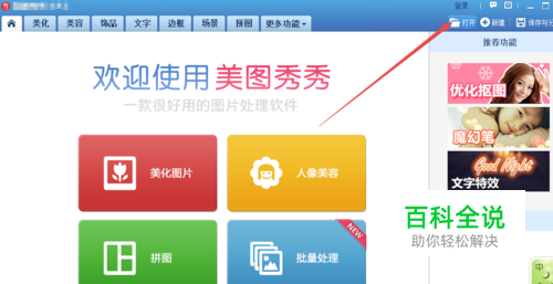 然后会打开一个 欢迎首页;点击右上角的 打开 菜单选项。