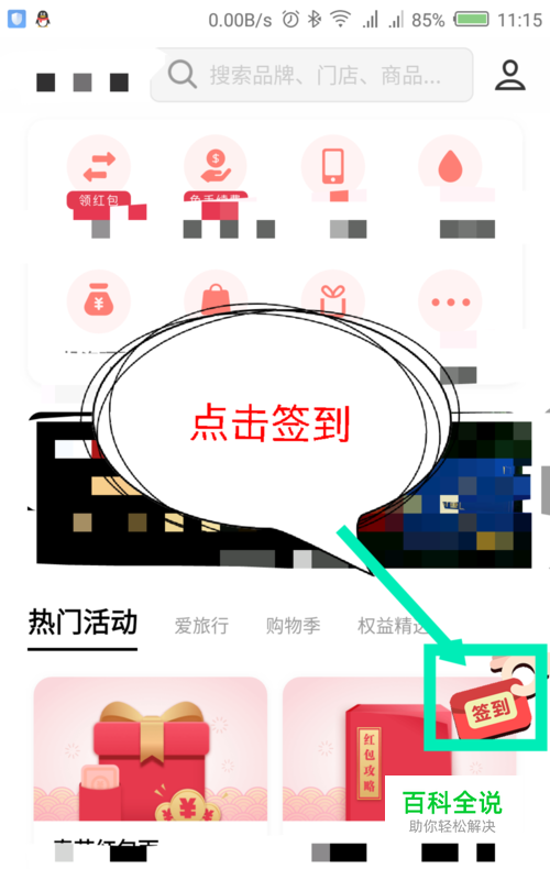 打开软件后,默认的主界面是享优惠界面,在打开的默认界面,点击右边弹出的窗口中的签到。如图所示