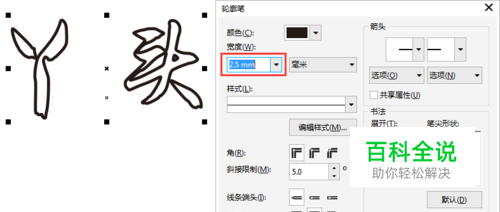 选中文字,鼠标右键单击调色板中黑色色块,左键单击无填充色值,按下F12调出“轮廓笔”,根据要求,设置文字宽度,如图。