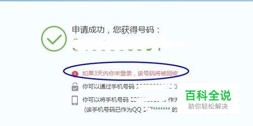 申请成功后就会出现申请好的QQ号码,并提示三天内登陆,否则号码会被收回(如图);