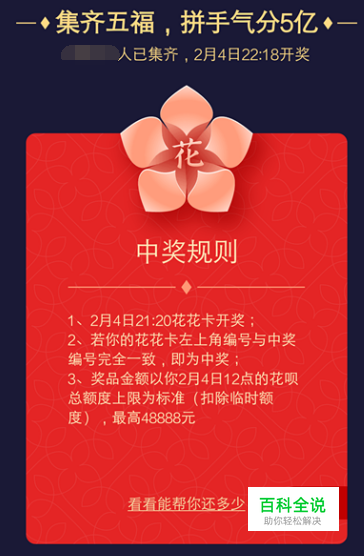 花花卡开奖时间:2019年2月4日21:20; 额度:你的花呗额度*12,但最高48888;没有花呗,给2019元红包 份数:2019份 具体见下图:
