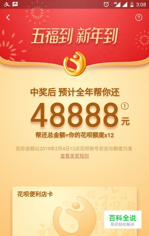 花花卡是2019支付宝集五福活动中的新的卡片,有这张卡主要是用来抽取【帮你全年还花呗】的大奖,帮你还款的金额=你的花呗额度*12,最高全年可以帮你还48888元。