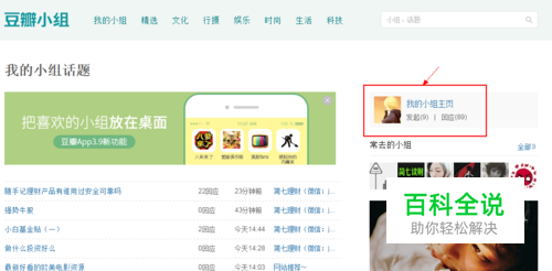首先登录豆瓣账号,在上方导航栏里点击【小组】,进入豆瓣小组首页。在右侧找到自己的头像,选择【我的小组主页】或者直接点击【发言】进入发言列表。