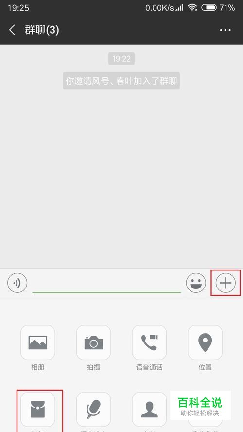 打开微信,进入要发红包的群——输入框右边点“+”——选择“红包”