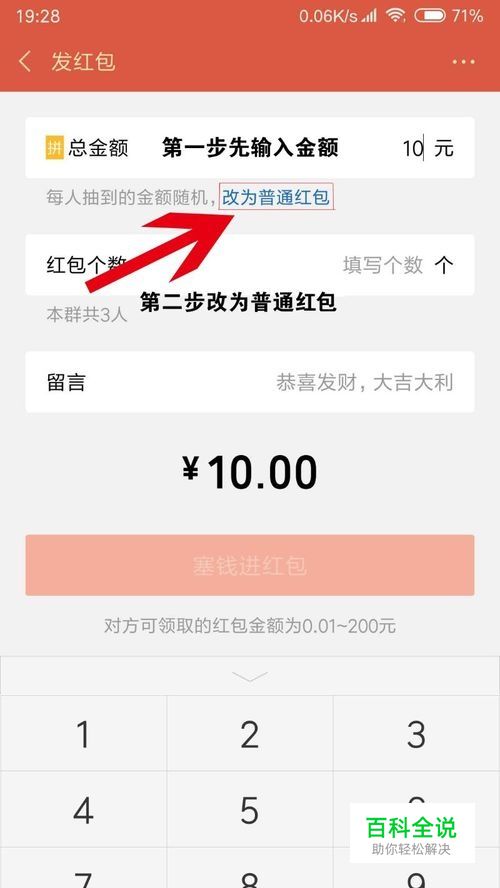 进入红包页面。 先输入金额,再点“改为普通红包”。 特别注意:输入的金额是单个红包的金额,发红包的总金额,不要发错了。