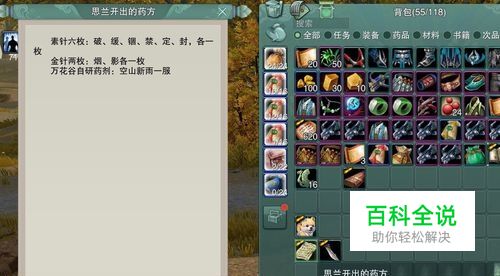 (剧情篇) 去鹿奔原找朝行的师妹思兰,她会告诉你医治狗狗需要一些药材,并且给你一张药方(如图),让你按照药方将所需物品配齐。 其中包括:素针六枚(破、缓、锢、禁、定、封)、金针两枚(烟、影)、万花谷自研药剂空山新雨。 东方算了下,有点贵,等我下次再摸到就来体验剧情,-_-||。