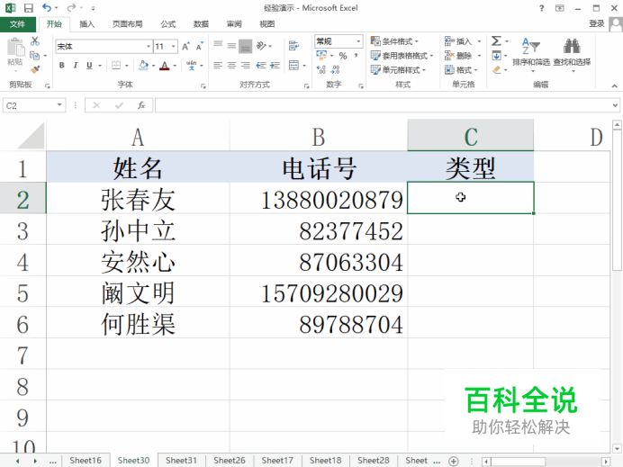 准备单元格结构。 在C列新建一列用于存放区分结果,将电话号区分为手机号和座机号。