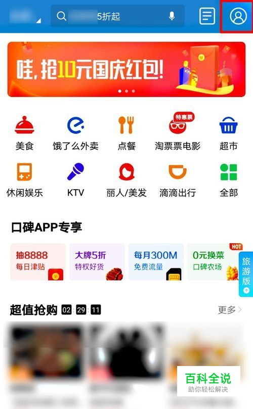 点击“口碑”选项,进入口碑的页面。 注意右上角有个用户头像标识,点击它,可以找到自己的订单。