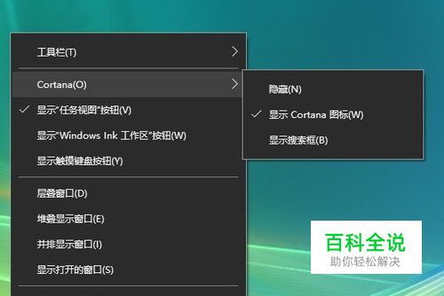 若在开始菜单图标旁边没有看到小娜,右键任务栏,在菜单中选择Cortana>显示Cortana图标或者显示搜索框。