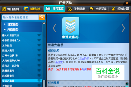 首先告诉大家如何获得月光宝盒这件必备的道具。进入“任务活动”中的“兑换任务”,找到“幸运大富翁”。