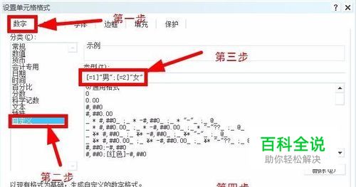 在弹出的“设置单元格格式”对话框中选择”数字“项,在”分类“中选择”自定义“,然后在”类型(T)“中输入:[=1]"男";[=2]"女" ,点击确定,如图: