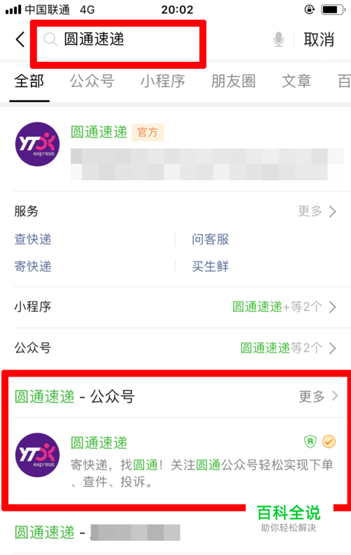 在微信的搜索框内输入“圆通速递”,点击搜索。选中下图所示红框位置的公众号。