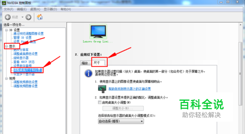 在显示下面点击调整桌面尺寸和位置-》在应用一下设置下面的选项卡中选择尺寸