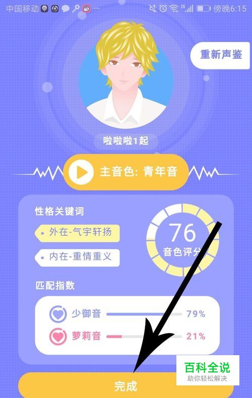 稍许,经过吱呀app的系统的声音鉴定后,就可以得到新的声鉴结果了,最后点击“完成”即可退出