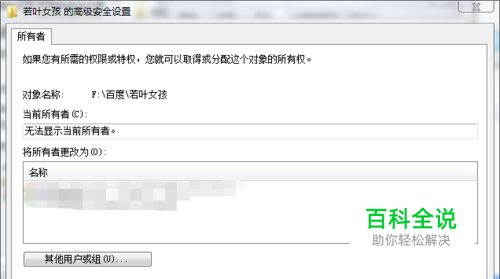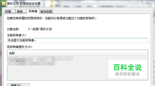 在“所有者”内点击编辑,在“将所有者更改为”内选择你的计算机名称,然后将“替换子容器和对象所有者”应用并确定即可,然后就可以打开文件夹了。