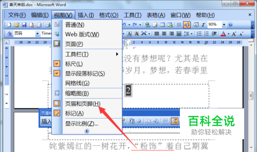 我们点击“视图”菜单——“页眉和页脚”。(其实我们插入的页码,也就是在页脚处展示啦)
