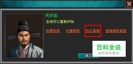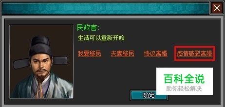 离婚: (1)协议离婚,夫妻双方组队前往开封--龙庭广场--民政官处办理离婚。(费用免费,与亲密度无关。) (2)感情破裂:单方到开封--龙庭广场--民政官处办理。(亲密度100以下免费,亲密度100以上需要花费50元宝,无需组队。) (3)解除婚姻关系后,亲密度清零。 (4)如需移民,需先和伴侣解除婚姻,一起移民时亲密度不变。
