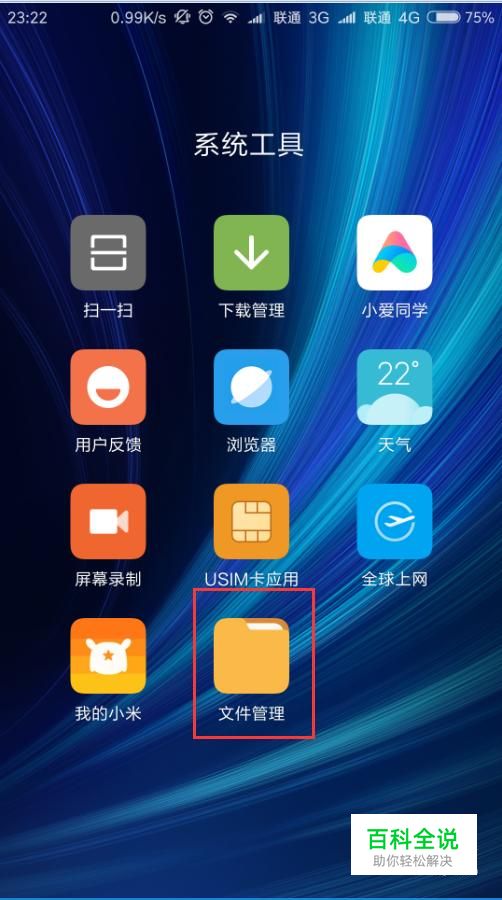 首先,打开MIUI系统桌面,点击找到“文件管理”应用APP。