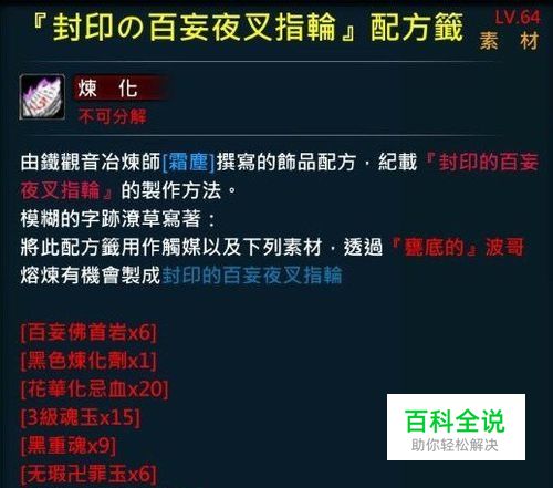 《封印の百妄夜叉指輪》配方籤 可以藉由熔爐,合成出封印的百妄夜叉指輪。 封印的百妄夜叉指輪合成配方: 《封印の百妄夜叉指輪》配方籤1個,百妄佛手巖6個,黑色煉化劑1個,花華化忌血20個,3級魂玉15個,黑重魂9個,無瑕卍罪玉6個,強效波哥胃腸藥4個。