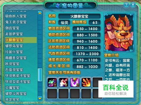 火麒麟 综合来看火麒麟毫无疑问是65宠物里面最为优秀的,BY的火麒麟拥有拥有更高的资质,1300的法攻上限,血资质1900,双防1200+,对于这样一只宠物,至少在65级这个区间,它是相当完美的。再加上他天生具备的高级重生,和近乎完美霸道的群火了。 但是,没有绝对完美的宠物,火麒麟唯一不足之处,没有单法,不利于单挑捉鬼等需求。想要进一步提高可用性,化一个单法是必要的。 这里推荐水系单法,有的宠有火吸,有的宠有水吸,水火皆备,是为无敌。 推荐使用职业,全职业。 如果想更加完美化火麒麟宝宝可以化毒,法伤技能,其次是强迫。OK,如果以上所说都具备,那么这个宝宝已经相当完美。