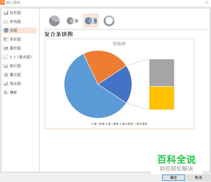 选择饼状图,并选择需要的类型(有四种选择),选好后点击确定。