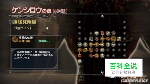 主角拳四郎的重要技能-疾风的体技,就在经络位置一开始的右上方不远处,需尽快点出才能灵活的收招与闪躲。再来就看玩家著重基本连段的破坏力还是斗气奥义的杀敌方式,而有不同的点选路线。