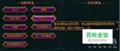 【皇后的职权】 惩治派系:在“宣政殿”,皇后可通过中书令的功能列表中的“惩治派系”功能,运用自己皇后的权力惩罚指定派系。 大赦天下:同样在“宣政殿”中书令处,皇后还可消耗自己的资源,使全服玩家都能获得功勋和银两奖励。每天只能执行一次。
