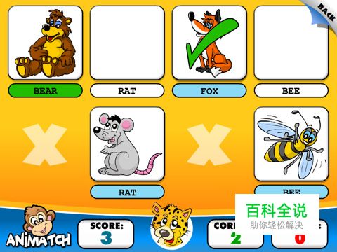 2.★游戏模式 在比赛状态,任务是把所有的动物图标和他们的名字匹配起来。游戏分为三个难度。要想让孩子们更有兴趣,最高分将在游戏结束时计算出,这样孩子们就为了不停刷新纪录而努力。