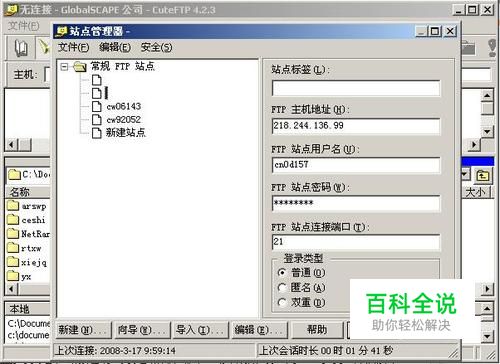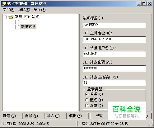 3.定义站点:\ 点击“新建”建立FTP站,然后定义站点标签,可任意填写。“FTP主机地址” 中填入您的IP地址或您的域名都可,如:218.244.137.201 ,“站点用户名”中填写您的用户名(管理员用户名),“站点密码”中填写您的密码。输入密码时,框中只有*字,防止被别人看到。FTP连接端口为默认的“21”,登录类型请选择“普通”。