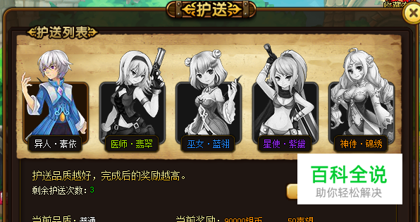 护送妹子啦,快到4013《冒险契约》里护送妹子吧! 1.基本说明l护送系统在玩家30级时投放,主要是玩家银币与声望获得的来源; 系统有双倍护送时间,在该时间内完成护送任务则可以获得双倍的奖励; 护送入口:皓月城帅哥比尔处:如图; 护送目标有品质,分为普通、优秀、精良、传说、神话,品质越高,护送后获得的收益越高; 2.操作说明 如何护送: a)打开护送界面; b)点击开始护送即可,开始护送后,将会有一个护送目标出现在场景中的角色模型身后: 2.如果刷新品质: a)在护送界面点击刷新则可以更换护送目标的品质; b)品质越高,获得的收益越大。 c)满级:可以一键刷新到神话品质。 3.如何在中途被打断后继续护送: a)在护送开始时,会弹出一个护送的即时界面; b)点击关闭后该界面会最小化到技能快捷栏上方; c)在中途护送被打断时,可以打开该界面; d)点击界面中的自动前往就可以继续护送,如图: