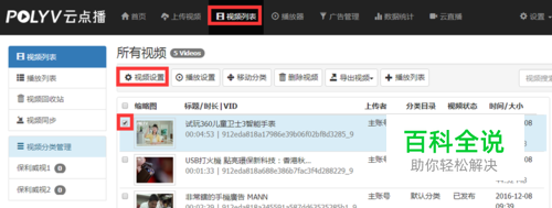 在登陆保利威视的后台,进入【云点播】的界面后,点击顶部功能列表的【视频列表】,选中您想设置播放密码的视频,点击【视频设置】,如下图: