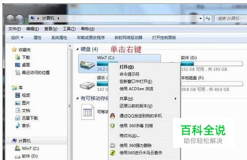 打开计算机,鼠标移至系统磁盘上,单击右键,选择“属性”。