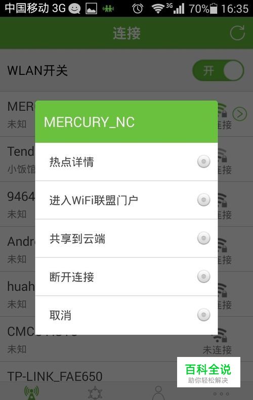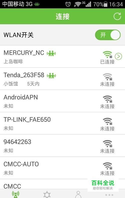 免费WiFi的使用。 打开WiFi联盟APP,进入“连接”模块,点击右上角按钮刷新,如果发现连接后有绿色WiFi联盟Logo,则该WiFi可以免费连接。例如图片中的MERCURY_NC。