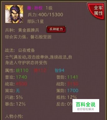 属性:统110 勇112 智94 招募费用:15000 兵种介绍:综合实力强、磐石般坚固 战法介绍:士气满发动,攻击敌单体,连续战法,自身进入守护状态并受伤 攻击系数:555 普防系数:1255 战防系数:1190 策防系数:700 闪避:5% 抵挡:12% 暴击:12% 反击:0%